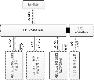 LP1-24M16R型PLC用来处理控制系统的逻辑部分,采用公司的专用梯形图视窗,可以根据用户的需求方便及时的增加减和修改功能。模拟量拓展EX-2AD2DA型PLC模块输出一定的电压控制变频的频率从而控制切刀电机的运行。